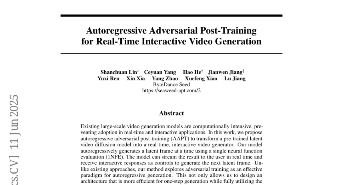 想象一下,如果你能像玩游戏一样实时控制AI生成的视频内容,让虚拟角色根据你的手势立即做出反应,或者让摄像机按你的意愿在虚拟世界中自由穿梭,这会是怎样的体验?字节跳动种子实验室的研究团队刚刚发表了一项突破性研究,让这样的科幻场景成为现实。这项名为"自回归对抗后训练的实时交互视频生成"的研究于2025年6月发表在计算机视觉顶会上,完全颠覆了我们对AI视频生成速度的认知。